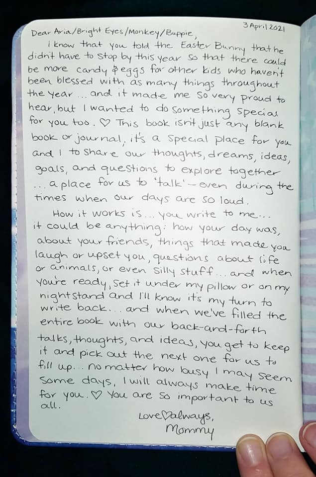 Dear Mom, I didn't make Easter baskets this year. I didn't want to. The girls already have so much--so many lovely things... we've truly all been blessed in so many ways. Aria even said to tell the Easter Bunny that he can skip over our house so that he has extra to share with other kids who might need the surprises more. You'd have been proud. I was. She added that she didn't think Norah Jane would mind either since she's "too little to eat candy and doesn't have any teeth yet". Speaking of the baby, I know there have been a lot of changes since she was born--and although the older two understand the need to share their time with me, I still want to make sure they know that their importance doesn't diminish... their place in my life isn't any less prominent because there's one more to share my triply-expanded heart with. I remember the little notes you'd leave for Jenn, Tris, and I with "token gifts" as you'd call them... and how you always seemed to know how to make a single item mean so much more than any room filled with presents ever could. A musical snow globe... a stuffed giraffe plush that could fit into the palm of my hand... a hand-written letter, or a simple candy cane ornament. It was your heart... the love woven into every aspect of you being our Mom. I thought about it, but I didn't make any Easter baskets this year. Instead, I purchased 2 empty books with delicately decorated pages and penned a letter in each--hopefully the first of many. The girls are growing up so fast and I never want to miss out on our time together... you've taught me how precious it truly is... and how fleeting. I still cherish our letters to each other, me and you... except now, tears accompany the smiles as I read. I miss you, Mom. Love always, "Pookie"